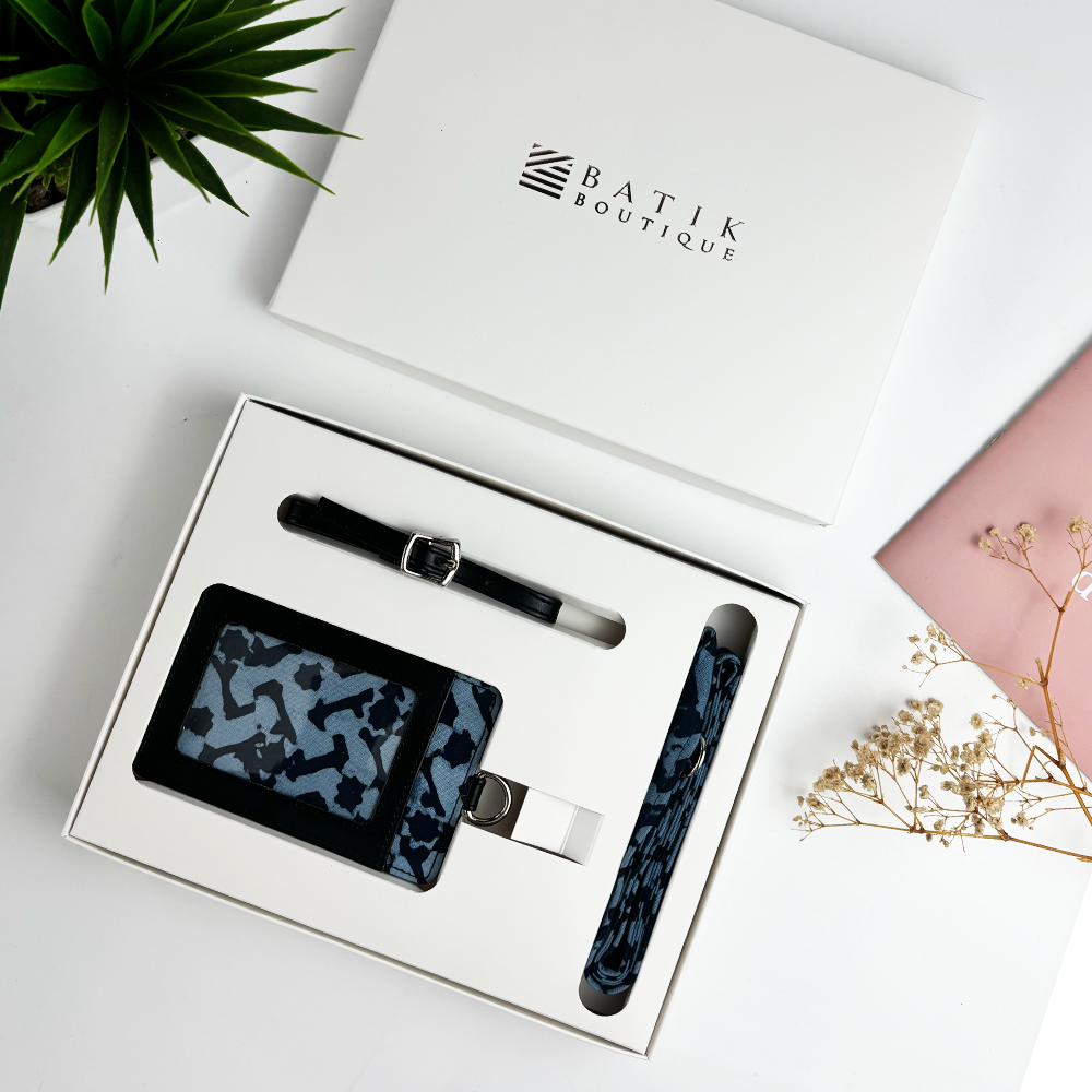 This Batik Lanyard and Luggage Tag gift set is lined with authentic Malaysian batik cotton in navy blue colors. It’s the perfect unisex corporate gift for those who value quality and functionality.