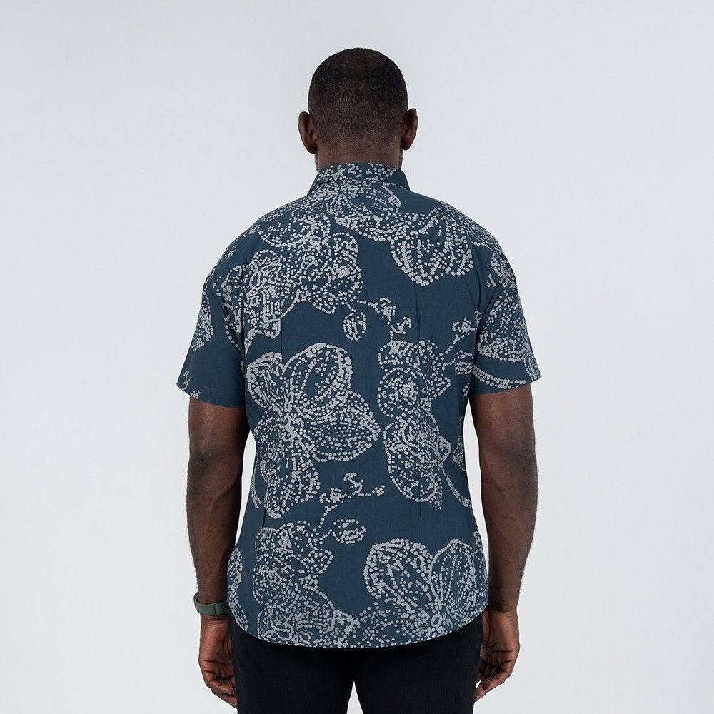- The Navy Orchid showcases a stunning two-layered batik design, meticulously hand-painted in sophisticated shades of deep blue and grey