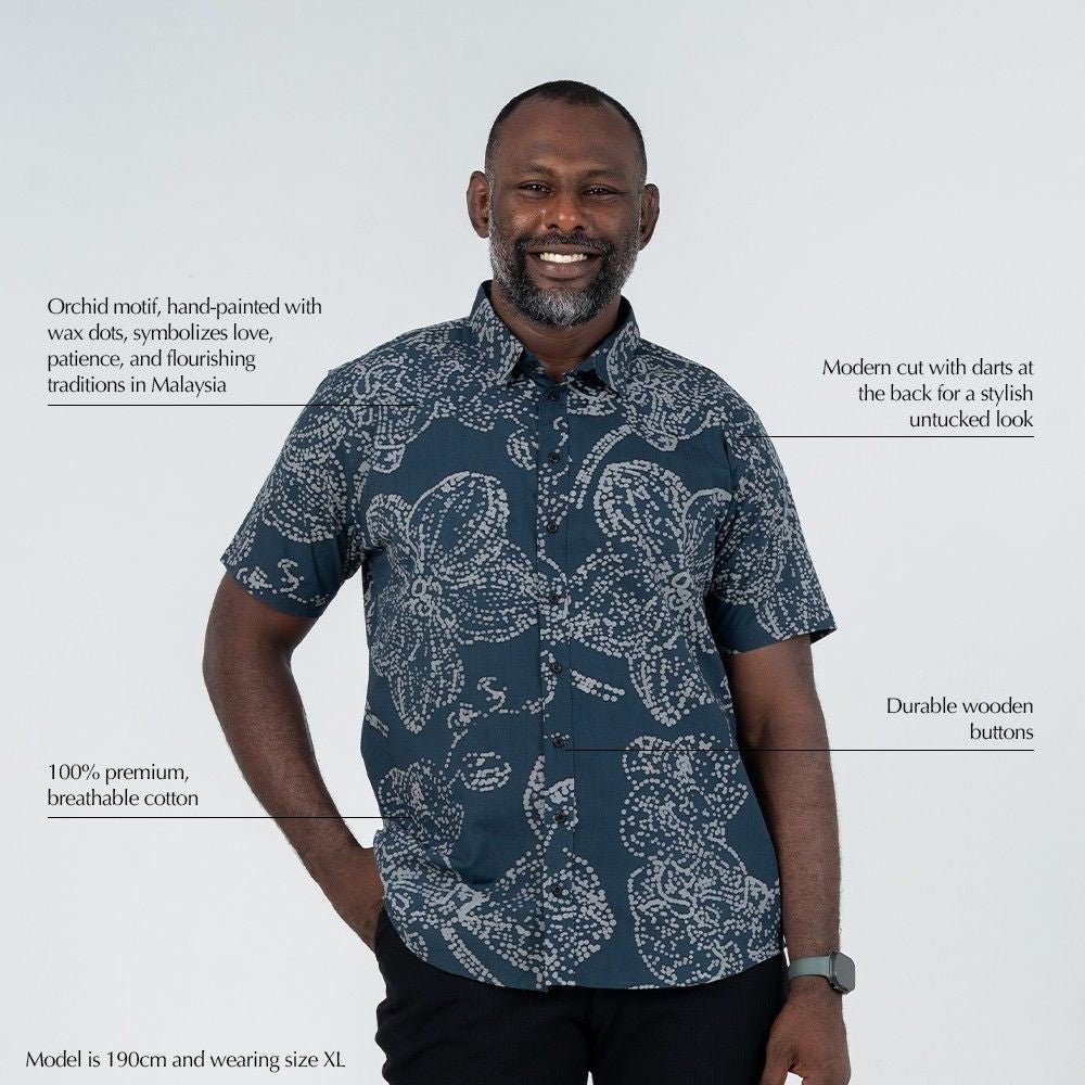The Navy Orchid showcases a stunning two-layered batik design, meticulously hand-painted in sophisticated shades of deep blue and grey.