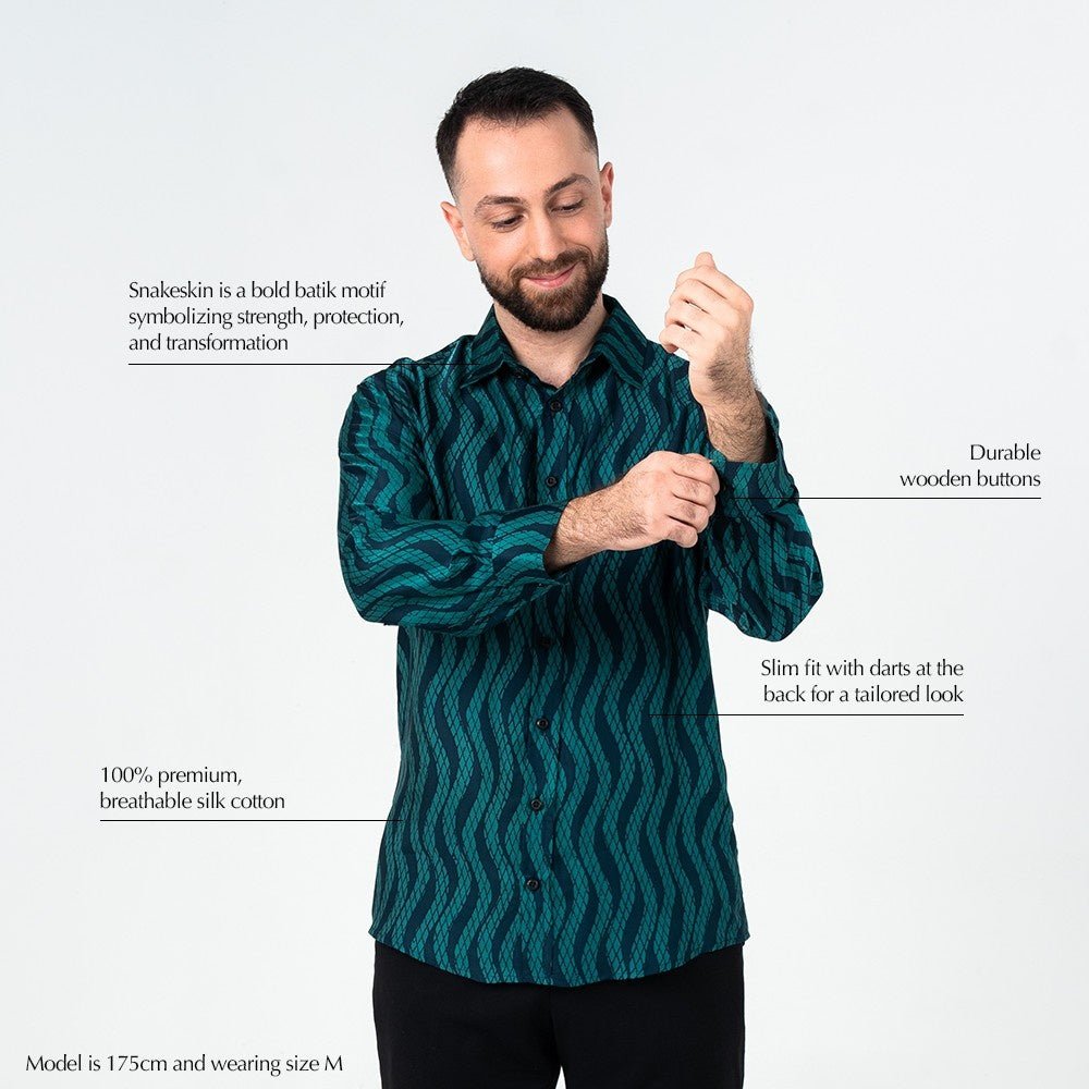 Men's Long-Sleeved Batik Shirt - Teal Snakeskin