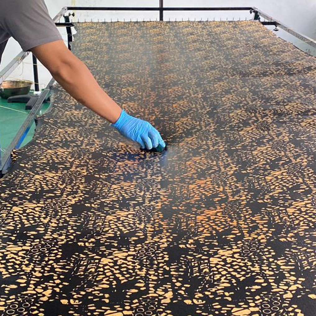 • The batik pattern "Leopard" expresses a bold yet intricate design in earthy beige tones against a deep black base